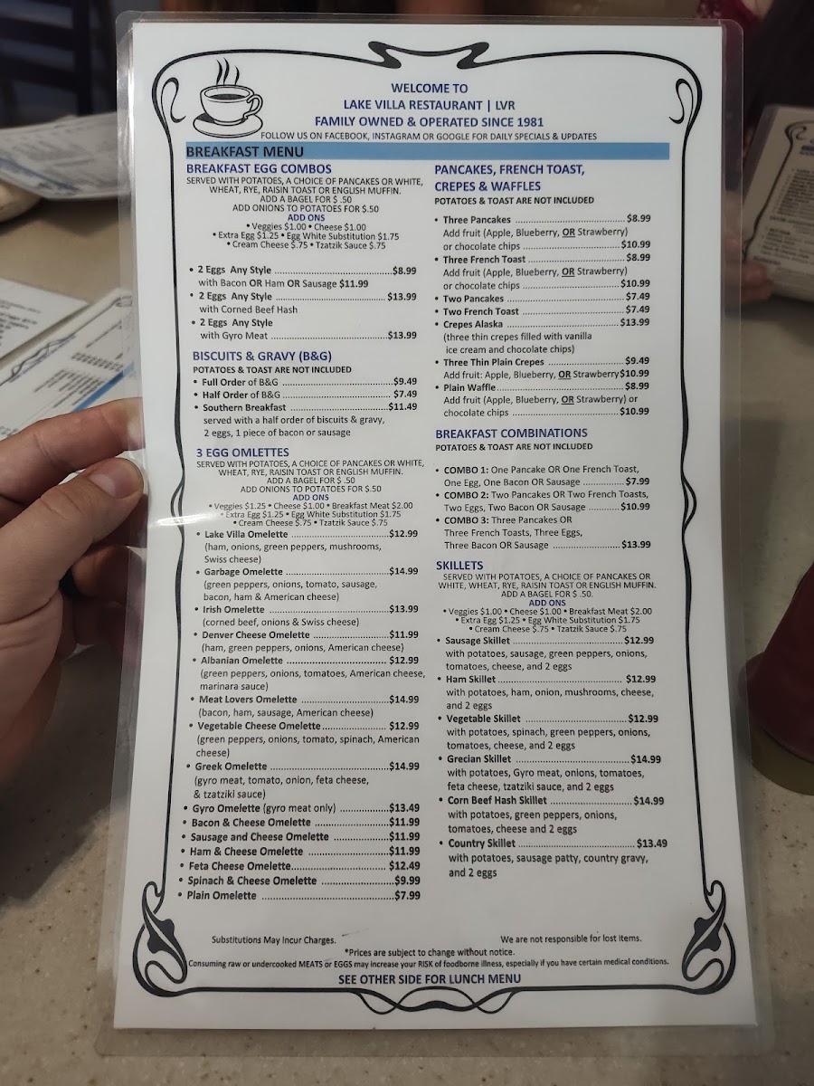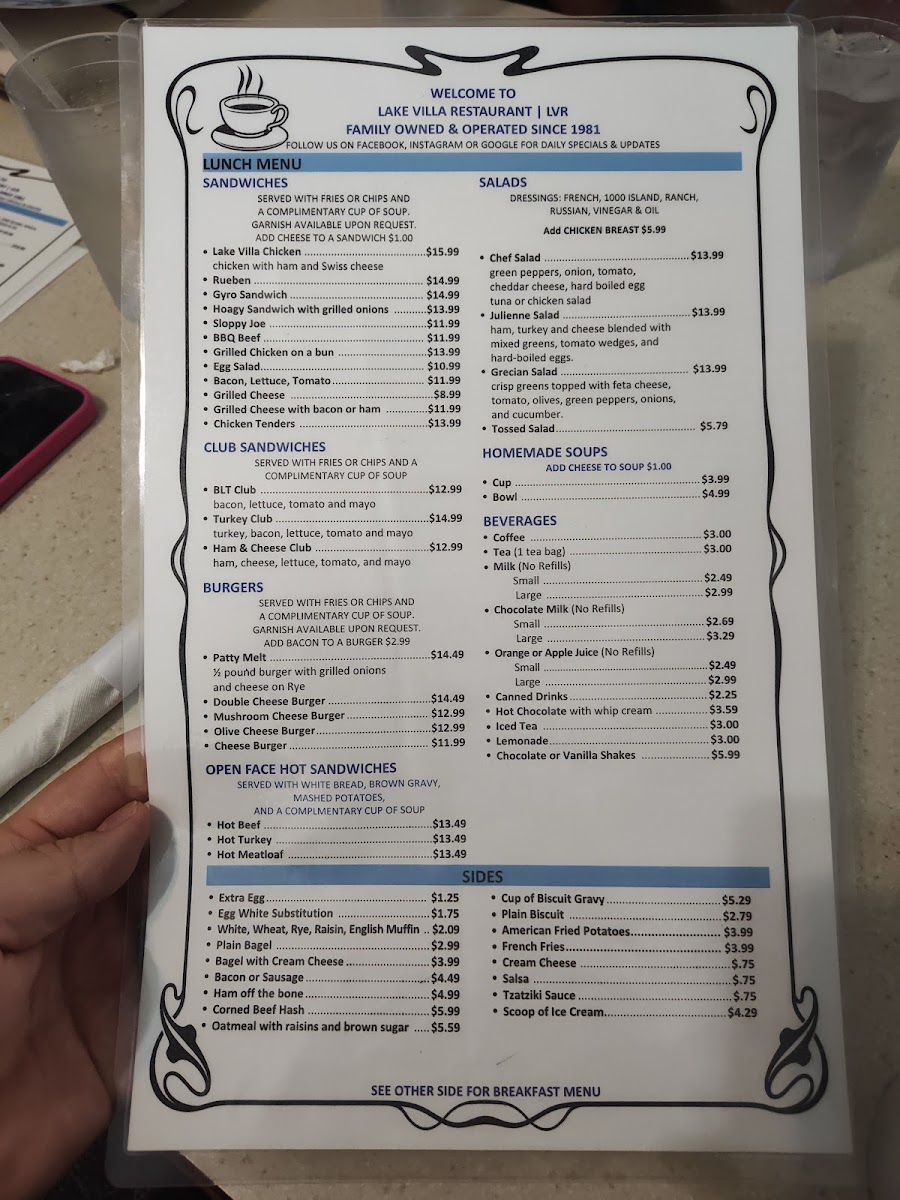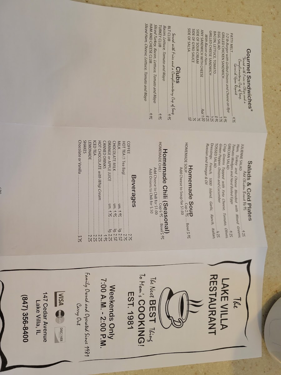 If you’re browsing the Lake Villa Restaurant Menu, you’re in for a mix of comfort and flavor that feels just right for this neighborhood spot at 147 Cedar Ave, Lake Villa, IL 60046. The menu reads like a collection of crowd-pleasers, from hearty breakfast plates and stacked sandwiches to satisfying dinner entrées that don’t hold back on portions. You’ll spot classic American favorites sitting alongside homestyle specials, which makes it easy to find something whether you’re craving a juicy burger, a fresh salad, or a plate of pasta that actually fills you up.